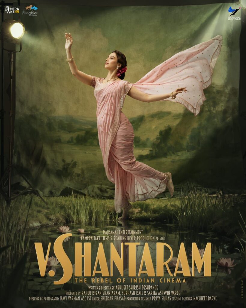 भारतीय सिनेमातील महान दिग्दर्शक आणि निर्माता शांताराम राजाराम वणकुद्रे (व्ही. शांताराम) यांच्या जीवनावर आधारित ‘व्ही. शांताराम’ या भव्य चित्रपटाचे पहिले पोस्टर प्रदर्शित झाल्यानंतर आता ‘जयश्री’ या अत्यंत महत्त्वाच्या व्यक्तिरेखेची पहिली झलक सादर करण्यात आली आहे. ही भूमिका अभिनेत्री तमन्ना भाटिया साकारत असून, व्ही. शांताराम यांची सहकलाकार ते सहचारिणी असा नाजूक आणि भावस्पर्शी प्रवास या व्यक्तिरेखेतून उलगडणार आहे.