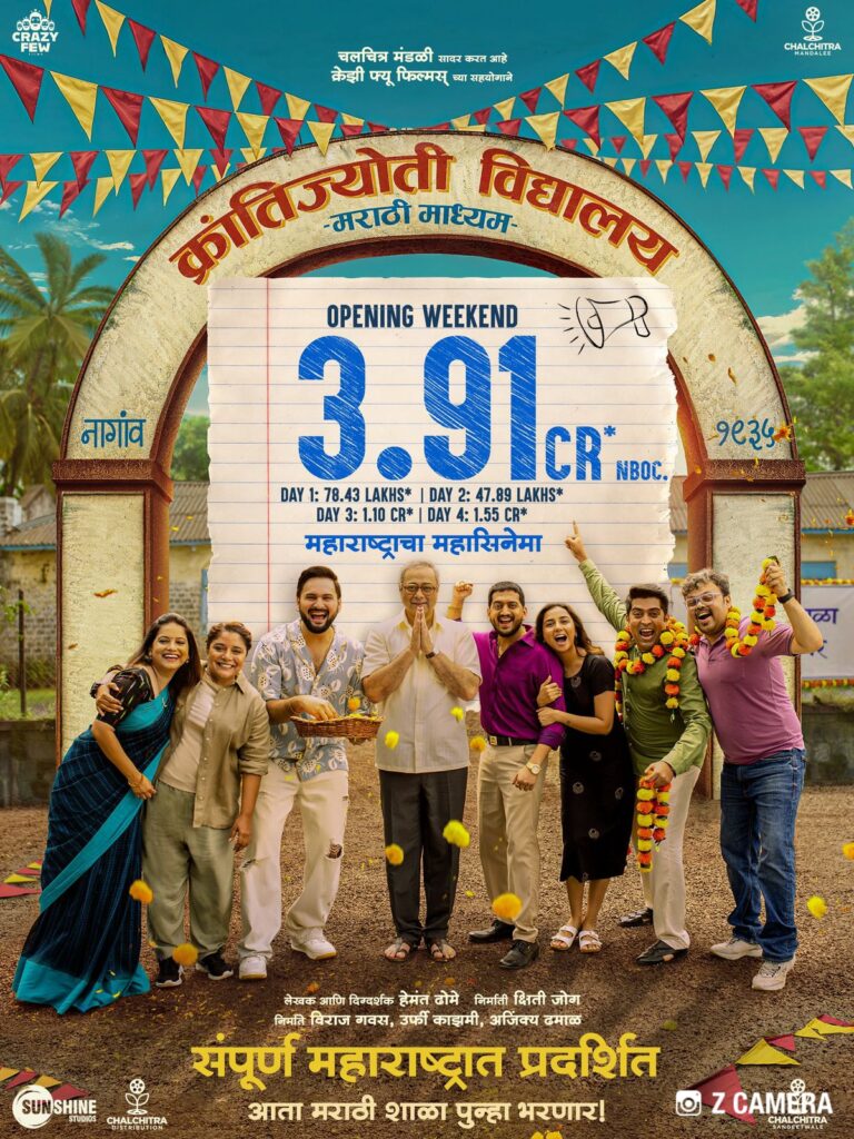 मराठी शाळेच्या अस्मितेला नवा आवाज देणारा ‘क्रांतिज्योती विद्यालय – मराठी माध्यम’ हा चित्रपट प्रेक्षकांच्या भेटीला आला असून, प्रदर्शित होताच चित्रपटगृहांमध्ये जल्लोषाचे वातावरण निर्माण झाले आहे. संपूर्ण महाराष्ट्रभर या चित्रपटाची जोरदार चर्चा सुरू आहे. तसेच सोशल मीडियावर व बुक माय शोवर चित्रपट ट्रेंडिंग ठरत आहे. या चित्रपटाने पहिल्याच वीकेंडला तब्बल ३.९१ कोटींचा गल्ला जमवला आहे. जोरदार कमाई करत हा चित्रपट बॉक्स ऑफिसवर धुमाकूळ घालत आहे.
